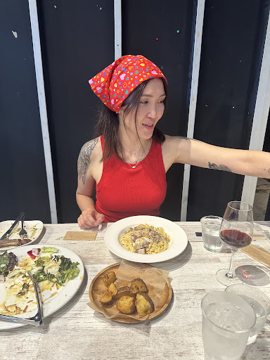Most of all we were tremendously impressed by the chefs cooking: We had lamb chops (perfectly cooked, tender meat, crisp around the bone, with delicious spices and taste out of this world), their signature salad (take a large one next time) Pasta with porcini (best fresh pasta I had in my life) , pizza margarita with pesto and basil leaves, potatoes in their skin,