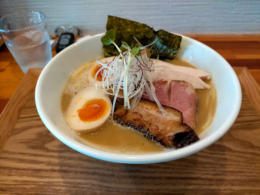 Read more特製醤油らぁめん¥1,000+手揉み太麺¥50 日曜日の午後1時、店前の3台分の駐車場に空きはなく、店裏の3台分の駐車場の空き1つに運良くピットインできました。とは言ってもお店は満席なので前客3のウェイティングリストに記名し、店外で待つこと約15分で店内に案内されました。 標題をポチッとしてカウンターで食券を渡します。お水はセルフサービス。店内はカウンター7席、小上り2つとこぢんまりとした感じです。ご夫婦でやられているようで、開店前にバックパッカーとして世界を回っていたときの写真が沢山展示されています。コロナ対策なのか席番号で呼ばれ、待つこと約15分で受け取ることができました。 ビジュアルはとてもシンプル。お洒落な白の細身の器に、トッピングは小ぶりの胸チャーシュー2、ロースチャーシュー1、炙りバラチャーシュー1、半熟味玉、拍子木メンマ3、海苔1とカイワレ少々。 スープは、無化調ながら甘味とコクのある鶏出汁で、生醤油のカエシは癖を抑えながらも特徴付けています。 手揉み太麺は、量は200gぐらいかなぁ。特製なら大盛でも良さそう。見た目は沖縄そばを彷彿とさせますが、滑らかな口当たりでスープによく合います。 お値段ややお高目ではありますが、こだわりの感じられるラーメンです。ほかのメニューにもチャレ...