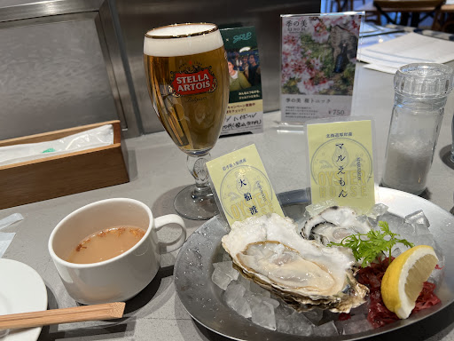 Read more久しぶりの生牡蠣をいただき、至福の時を過ごしました。 お昼時に選べるメニューは少ないですが、ランチメニューには生牡蠣が1ピースからついてきます。 今回は1ピースつきの1番小さいAランチを。 本日の牡蠣はマルえもんでした。 欲望に従って追加で岩手大船渡をいただきます。 ランチビールも笑