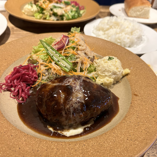 ハンバーグ、とてもジューシーで肉肉しくて美味しかったです。170gとあり、見た目は小さく見えましたが、密度が凄かったです。 付け合わせのポテトサラダも美味しくいただきました。