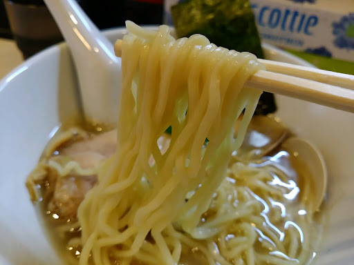スープを一口啜る……出汁はしっかり取っているが非常にあっさりしている。貝出汁系塩ラーメンの中でも特に淡麗な方かもしれない。「ラーメンはジャンキーさがあってナンボ」という方には物足りなさがあるかも(そういう人は近所の「これが好きだから」なんかに行っちゃうんだろうけど)