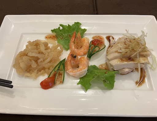 前菜三種盛りは、鴨のロースト、えびの塩茹で、蒸し鶏 蒸し鶏は甘い醤油がかかっている