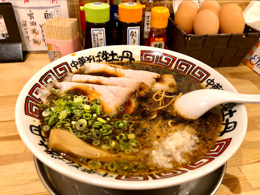 美味しかった。豚と魚のWスープだそうでなかなか美味しいす。注文したのは牡丹ラーメン、メニューの一番最初に書かれてあり、基本であり、お店のイチオシかと思い注文しました。チャーシューも薄かったけどバラだったのでとろとろで好きなチャーシューでした。麺も細麺でしっかり腰があるし、バリ固も選べます。チャーハンは西宮ブラックという黒いチャーハン。溜まり醤油を使ってはると思いますけど、店の人に聞いたわけではないので間違ってたらごめんなさい。黒いけど、味が濃いわけでも辛いわけでもないので普通に食べれます。これも美味しかった。私、ラーメン屋さんで、ラーメン、チャーハン、餃子をたいてい頼みますが、今回は餃子ではなく、特製とメニューにうたわれた唐揚げを頼みました。何やらお店の自信を感じたからです。結果、ビンゴでした。見た目はコロコロしてて、あらハズレかなと思いきや、いわゆる外カリカリ、中ジューシーってやつでした。凄いサービスがあります。ラーメン頼んだ人はなんと生卵が...