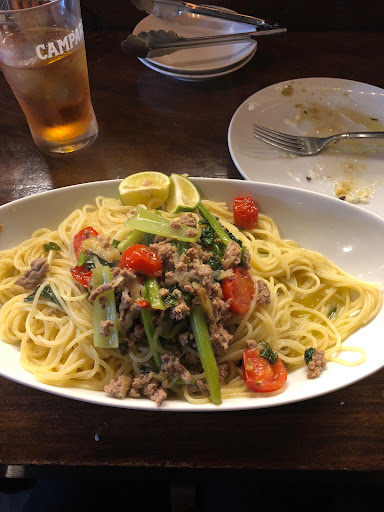 汗をかきながら食べました笑 王道のオーリオペペロンチーノ好きにはオススメできませんがパスタ好きにはオススメですね 店の雰囲気、店員さんは親切丁寧です