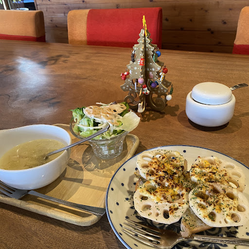 初訪問でしたが店内に入るとクリスマスの音楽と装飾で一気にテンションがあがりました。 迷いに迷ってハーブチキンとブレンドコーヒー、 スープとサラダも注文。待っている間に お水かと思って飲んだのがお白湯で冷えた身体に 沁みて思わず白湯嬉しいです!っと伝えると お店の綺麗なお姉さんがニコッと笑ってくれて 店長さんに伝えに行ってました。よくみるとテーブルにはそれぞれのテーブルに気持ちのよさそうな膝掛けが置いてあったり本棚があったりお客様への ホスピタリティ完璧です。 店主の方が無愛想という口コミがみうけられましたが職人肌な感じでこれだけ来る人の気持ちを考えられてるのだからきっと中身は優しい方なんだろなーと思いました。 まず出てきたスープの温度も熱々で感動 サラダも蓮根と水菜のシャキシャキ感がとてもアクセントになってて美味しかったしハーブチキンの深みのある香ばしいお味ったらこれまた美味しいって 身体が喜んでました。 そしてなんといってもコーヒーの美味しい事。 訪問した日がクリスマスイブイブだったので 可愛いカップにサンタさんの絵柄のクラッカーが ついてきてこれまた感動でした。 家で飲む用のコーヒーを買うのにもお会計の間 腰掛けてて下さいねと言っていただいたし 最後に全部美味しかったです!っと伝えたらニコッって笑っていただきました。 無愛想って言われてる方の笑顔ゲットできて 嬉しいしまた是非訪問したいと思えるゆったり素敵な時間を過ごせました。 ...