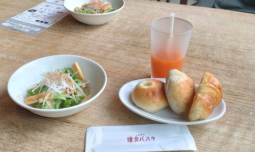 パンを取りに行くが、種類ごとに分けられておらずごちゃ混ぜ。品名は壁に並べて貼っているので似たようなパンはどれがどれかわからない。 東灘の店は種類ごとにトレーに分けられており、品名の札もピンで立てられていたので、それが鎌倉パスタの標準だと思ったが、こういう所に接客の気持ちが表れている