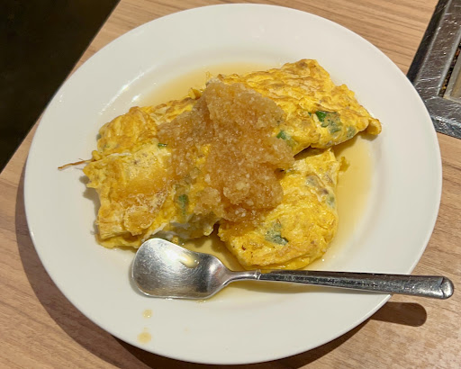 Read moreすじオムレツ ¥825込 ねぎ入りのとろっとした玉子焼きの中に 小さいすじが入っている おろしポン酢がかかっていて、さっぱり 味の濃い粉物の間に食べるとお口直しになっていい