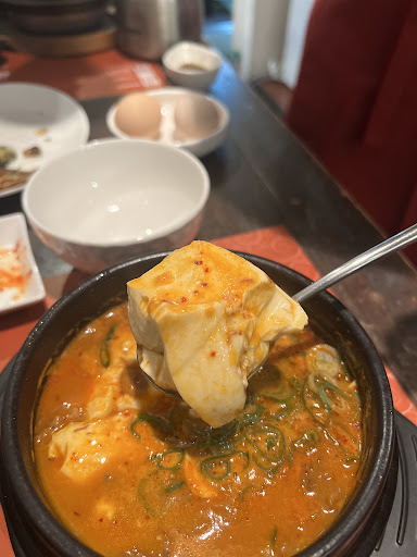 2025年5月頃 2回目の訪問です🌶初めてここのスンドゥブを食べて帰ってる時から早く食べたい!と思ってしまうくらい大大大好きです♡ 1度目は鶏コラを頂き2度目は海の幸スンドゥブを頂きました🦪🐚 Googleの口コミをみて肉の旨みより魚介のほうがおいしい、と拝見したのですが、わたしも魚介の方が好みでした。好みもあると思うので是非食べ比べてください、魚介と肉ではスープの旨みが全然違いました! 卵も是非追加してください、まろやかでおいしくなります🥚 鶏コラは鶏肉ホロホロ…鶏肉の量もたっぷり、豆腐もトロトロ! 海の幸も海鮮(エビ、ホタテ、アサリ、牡蠣など)沢山入っていてびっくり!具の量、大きさ大満足です😋 おかずのもやし、カクテキもパクパクたべれて(おかわり可)とっても美味しかったです。ごはんも釜飯でホカホカ炊きたてご飯をいただけます🍚 注意していただきたいのは、スンドゥブもごはんも激アツ🔥なので火傷に注意してください。石窯ごはんの縁に腕が当たってしまい少しだけ火傷してしまいました💦 食後は柚子茶を頂けるのでお口の中さっぱり! お腹の中は唐辛子の辛さと刺激、熱さで夜までホカホカでした🔥