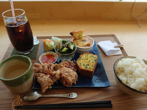 Read more支払いが現金以外も使えた! あんまりカフェ感はないけど ご飯美味しかった! 唐揚げ以外は 月替り(ミニデザートは日替わりなのかな?)なのかはわからないけど他の方のレビューとは変わってた Googleマップには載ってないけどInstagramあるみたいなのでそこからわかるみたいです 唐揚げもそぼろ丼もご飯大盛りにしたけど唐揚げのご飯は大盛りなのかよくわからなかった ドリンクが思っていたより大きくて満足 ラストオーダー10分前とかに行ったから白米しかなかったけど食べられてよかった あとそのせいか多分もう片付け始めてたせいか 提供までに15分くらいかかった ギリギリに来て申し訳ないなと思いました ラストオーダーすぎたら普通にお客さんと同じテーブルでご飯食べ始めてたのには驚いた あと場所が場所だからお店や施設に関係ないであろう人が駐車場に車停めるので 駐車場じゃないとこ...