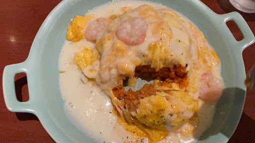 嫁はタンポポのオムライス(エビクリームソース) チャレンジの前に味見で1口 オムは普通に美味しい だがクリームソースが安っぽく、エビがぷりぷりなんだけどちょとレア過ぎて気色悪かった (後ほどこのエビを大量に食べる羽目になる)