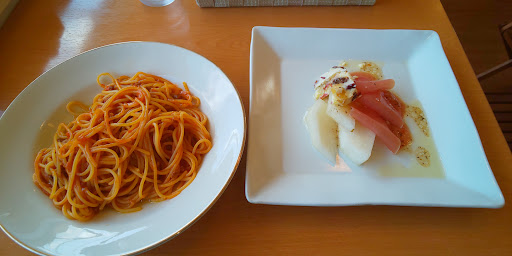 なのでパスタのボロネーゼを頂きました🍽️前菜も付いていました😃前菜は生ハム、梨、自家製チーズの盛り合わせ。特に自家製のチーズは干ぶどうやナッツ等が入っていて絶品でした🤤 パスタはしっかりした歯応えが残りソースと良く絡み美味しかったです😋🍴💕 食後のレモンスカッシュも爽やかな喉ごしてサイコーでした。