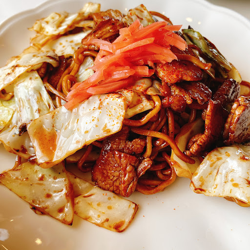 ハンバーガーを食べたい!と向かったあやさんでしたが、なんとハンバーガーは土日限定とのこと。それではと、気を取り直して焼きそば定食をいただくことにしました。すると、お店の女性が「焼きそばは2玉になりますが、宜しいですか?」とのこと。大盛りのお店なんですね。私は自称少食のおじさんなもので、焼きそばはシングルにしていただいて注文をすることに。 焼きそばはキャベツ多め、豚肉と蒲鉾が入っています。蒲鉾がなんだか嬉しい。ソースがしっかり効いていてご飯によく合います。お店は常連さんが集う賑やかな空間になってます。お店の人も感じの良い雰囲気でした。 次回は絶対にバーガー食べに行きたいです!