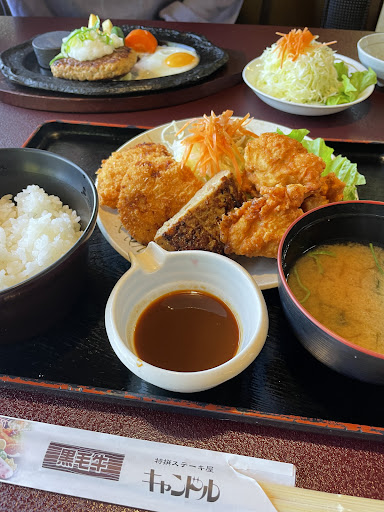 Read more地元のステーキ店、キャンドルに伺いました。チェーン店がひしめくステーキ業界の中で健闘しているお店です。 オーダーは名物の味噌煮ヒレカツ定食(ご飯小)。味噌はどて煮と同じような甘い赤味噌です。これにヒレカツをくぐらせています。その上にゴマとネギをぱらり。キャベツの千切りをのせた熱々の鉄板の上に5枚ヒレカツがのります。 定食はこれに味噌汁とご飯(写真は小)。私には量はこれで十分です。味噌煮ヒレカツは、甘味噌がトロリとして濃厚。一口噛めばヒレカツの衣がサクっとしていて何ともたまらない食感に。チェーン店では決して味わえない地元の味です。 店内はテーブル席が10席以上、お座敷などもあり、大人数でも対応できそうです。ドリンクバー付き。店員さんは愛想良くて気持ちよかったです。地元の常連さんに愛されているお店だと感じました。お弁当の注文もできるようです。土日は全面禁煙(これ重要!)。 確かかれこれ30年以上前はプールバーだったと記憶しています。昔はビリヤードをやりにこ...