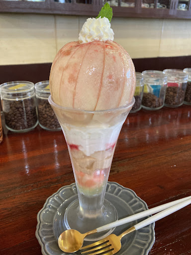 21/8/5再訪 3人で再訪。私は今回も桃パフェ🍑ですが、前回と種類も中身も変わっていました。今回もとても美味しかったです😊マンゴーも甘くて美味しかった✨全種類制覇したい〜