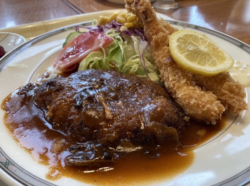 選べるハンバーグランチを注文 和風ソースでおかずは唐揚げをチョイス。肉汁系ではないが、外に目の細かいパン粉をまぶした、牛ほぼ100%の肉肉しいハンバーグ。 唐揚げは衣薄めのやつでした。 待ち時間は20分。