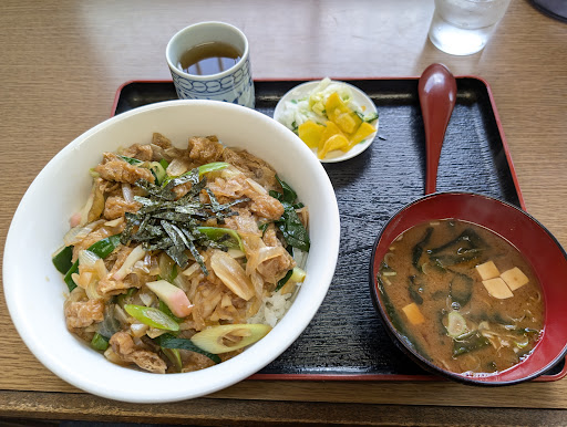 【志のだ丼】は甘めの醤油出しに油揚げ、玉ねぎ、ネギ、かまぼこが入った具材がご飯にのった丼でした✨ 見た目こそシンプルですが具材に良くダシが染み渡り、ご飯にも味が付いていてとてもボリュームもあり美味しかったです(●´ω`●) 付け合せに赤だしの豆腐とわかめのお味噌汁とたくあんと白菜のお新香が付いていました。
