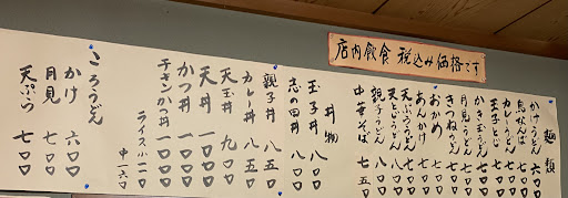 店内は質素ながら昔ながらの 風情がある感、壁にはメニューと値段。 どれも良心的な価格です。 高くても千円有れば大丈夫。 ※席にメニュー表は無いので注意