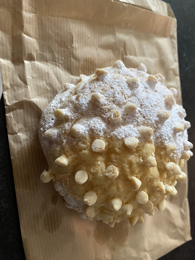 ホワイトチョコチップメロンパン 240円 表面のサクサク生地にホワイトチョコがトゲトゲについていて面白い。