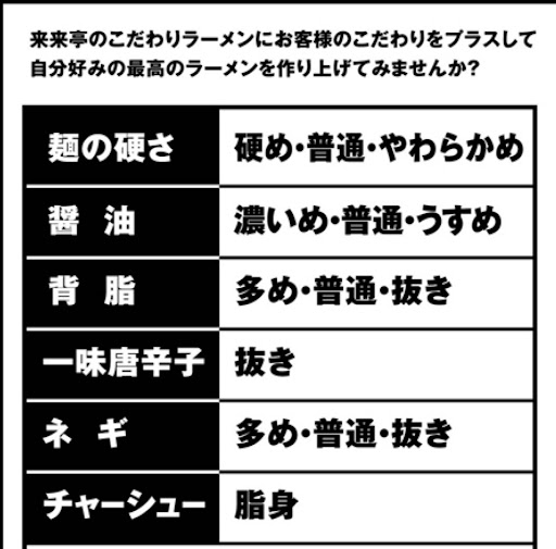 オーダーは席に着く前に出入り口付近にある発券機で購入する形式ですが、他のラーメンチェーンより来来亭は家族、子供連れが比較的多く訪れるからか出入り口でもたつく方が多い印象です。 そのため混雑時には席は空いてるのに食券を買うのに戸惑ってる人のせいで店内にも入れないことが多いです。 アプリなどのポイントも発券時に店員さんに声をかけないといけないので正直手間に感じます。 外国人の店員さんが多いので質問しても曖昧な返答をされたりします。 以前伺った際は自分より遅く入店して遅くオーダーしてた方の方が全ての提供が早く、いくら待っても来なかった為店員さんに聞きましたが特に謝られることもなく提供されました。