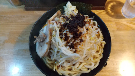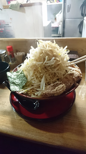 Read more2017.11.25土曜日の昼直前に初入店。店舗の入口には麺専門店を謳った表示があり、単なるラーメン屋では無い意気込みを感じました。。券売機、初心者にはどれを選んだら良いのかわからないし満席で店員さん忙しそうだから一番高い1,000円のボタンを押してみた。タイミングで運よく席が空きました♪どうやら昔ながらの醤油ラーメン、二郎系ラーメン、オリジナルラーメンが売りのようです。ちょっと待つと写真の品と取り皿が・・・1,000円払っただけのかなりのボリュームでした。かなりモヤシに醤油ベースのタレが掛かっており、分厚い肉やほぐし肉と一緒に食べる。かなりの量にやられながらようやく麺にたどり着くと、魚粉の香る醤油豚骨の利いたスープが極太麺によく絡み付いて食べ応え満点!ただ、あまりの量に満腹で、スープは飲めませんでした(笑) 2017.12月、再度訪問。前回の400グラムは食べるのに大変でしたが、300グラムで挑...