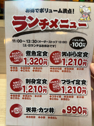飲みの居酒屋としては勿論、定食メニュー、パスタやラーメンなどの麺類、ご飯系まで、とってもメニューが豊富なので、子供連れでもしっかり食べてもらえて安心です。 先日も友達の誕生日に寄らせていただきましたが、新鮮な魚、大海老の天ぷら、どれも美味しかったです。