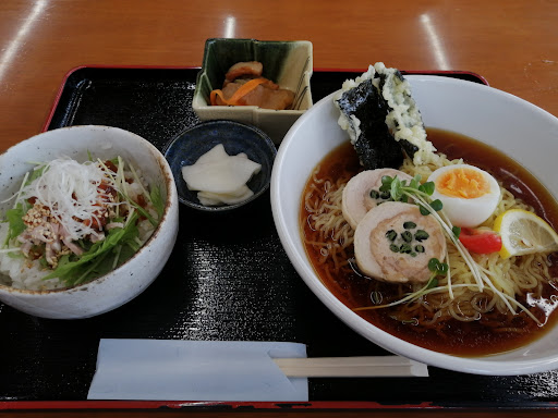冷やしラーメンは、地鶏を使ったスープだそうで、風味があってとても美味しかったです。好みによるとは思いますが、レモンの香りが口当たりをさっぱりとさせ、とても合っていました。さくさくの海苔天のトッピングも嬉しかったです。 ミニ丼も、さっぱり味ですが、チャーシューや新鮮な野菜がしっかり入っていて、食べごたえがありました。 副菜は、ありがちな塩辛さがなく、メインの二つを邪魔しないちょうどいい味で美味しかったです。
