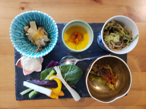 前菜はストーンプラートに季節の野菜のバーニャカウダや煮物、お蕎麦など6種類、どれも初めて出会う爽やかなものでした。メインの2種のカットステーキは柔らかくてソースや回りを彩る野菜やフルーツも絶品。ご飯やスープの量も多すぎず、女性でも食べきることが出来ました。デザートにはふきのとうのジェラートとチョコとナッツのパウンドケーキにヨーグルトソースを添えてさっぱりと美味しくいただきました。南部鉄器から注がれるコーヒーはまろやかで甘党の私でもブラックが美味しいと感じました。 また、自家製のパンも2種類出していただいて、ふかふかサクサクでとても美味しかったです。