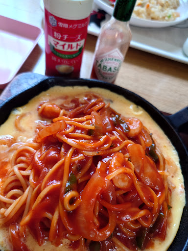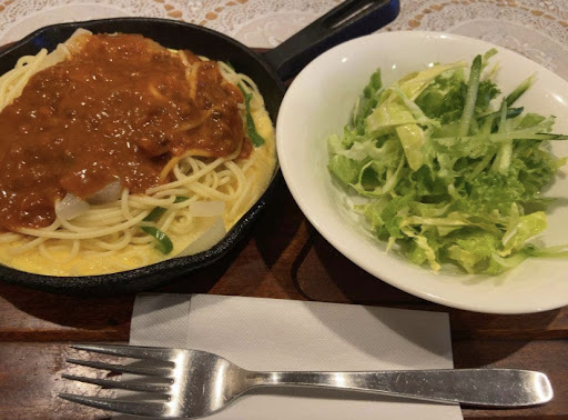 Read more向かいのゴハンヤさんに数回来てるのですが何回来てもやってないし週末来てもやってないので諦めてコチラのお店に入りました。 ナポリタン(サラダ付)700円 ハンバーグ定食800円 チョコレートパフェ500円 ナポリタンは鉄板でたまごの上に乗ってて色合いイイですね。酸味が強めの汁濁系でこのお値段でエビがいっぱい入ってました。 地元の方はみんなラーメ...