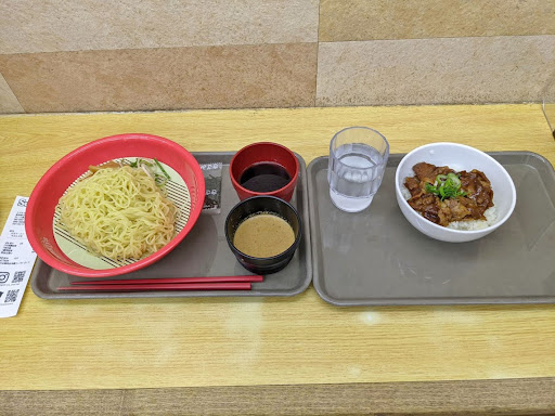オーダーしてから9分で呼ばれました。え、トレー2つですか(´・ω・`) ハシだけでいいな。別パックの刻み海苔は湿気なくていいね。おー結構コシがあるなぁ旨いわ。メンマと葱が貧弱だけどw ざるラーメンの浸けつゆは2種類なんですね。交互に浸けると飽きなくていいぞ。カツオ出汁のしっかり効いた醤油つゆはすっきり、濃厚金胡麻つゆはコクと甘みが楽しめるね。麺量もしっかりあって嬉しい。