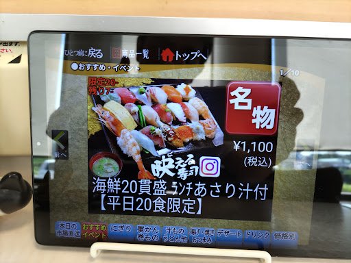平日の12:00頃に来店しました。 今回頂いたのは「平日20食限定 海鮮20貫盛ランチ あさり味噌汁付」です。 タッチパネルで注文するのですが、限定食の゙場合は残数が表示されてるのが非常に助かります。駐車場には6台しか停まって無かったから、今回は余裕でランチを食べれると思ってましたが、残り7つと表示されてたので少し焦りました。しかし、平日はあまり混んでないので、12:00迄に入店すればほぼ確実に食べれると思います。