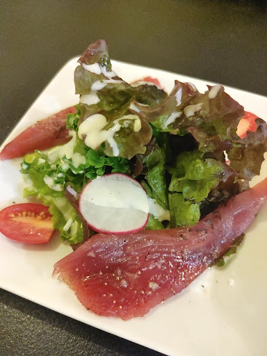まずは「刺身盛り合せ」を注文しました! この日のネタは、まぐろ・ムロアジ・カンパチ・炙り鯛でした。 あっさりとした旨味のまぐろと、甘くとろけるムロアジ! 口どけがすごく香ばしい炙り鯛と、甘みが強いカンパチ。 どれも薄めにカットされているので、食べやすいのが嬉しいですね〜