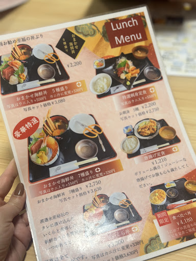 The four of us visited Noboribetsu station and Noboribetsu Marine Park NIXE. We spent some time at the Marine Park and decided to take a short 10-15 minute walk to this restaurant for lunch. In actuality, the food options in this part of town is basically nonexistent, aside from those options inside the Marine Park. We took a walk to arrive at this small and quaint neighborhood eatery. The reviews mostly said it was satisfactory so we had no suspicions when we arrived and ordered. The atmosphere is cute and feels like your typical small Japanese town restaurant. The menus of course had no English. We ordered three different kinds of sashimi bowls and one karaage set. Food arrived in tiny portions except for the karaage, which was huge. Simply put, sashimi was flimsy and mushy, did not taste or look fresh. The bowls were the size of a small rice bowl. Really did not reflect the price. However we chalked it up to tourist prices, since this was the only restaurant around. While we sat, 5 more groups of tourists came in and the place got packed. The worst was when I tried to take a bite of rice and the most disgusting strand of long black hair came dangling with the rice. Asked the lady politely to please change the rice, she took it away with not even a sorry. The food all tasted gross after that. If you have no time and are starving, this place is ok for you. If you have time and want bang for your buck, we would recommend that you find...