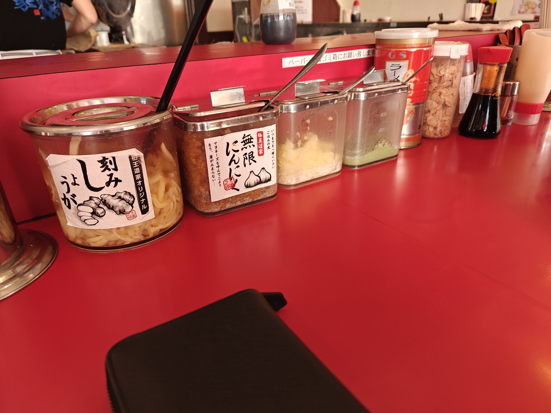 Make your order via machine at the door. This is all in Japanese. Sit down and wait for your turn. The staff member will ask if you have any preference as to the hardness of the noodles, the thickness of the broth and the amount of oil. You can say "no" and that's ok. Wait for your order to be placed in front of you. There is a water dispenser by the door where you can also grab a glass and napkins. There are also various condiments and things you can add to your ramen on the table in front of...