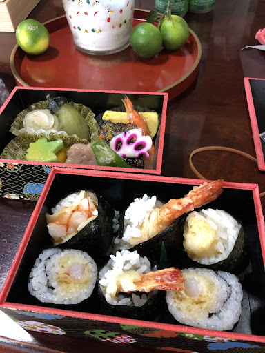 お食事は、野菜の炊き合わせ、天ぷらや卵焼、海老などの主菜。 白米、香の物、茶碗蒸し、土瓶蒸しがお重に入っており、見た目も楽しく、たくさんの種類のお食事を温かいうちにいただけて嬉しかったです。