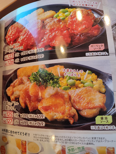 たま~に行くファミレス 今回食べてみたい商品のクーポンがあって行きましたが、 (ビーフ100%粗挽きステーキハンバーグ) 来店(月)18:35品切れで、がっかりしました。 他商品を決めるのにも時間が掛かってしまい、 主人は、カットステーキネギ&オニオンソースを 頼みましたが、スジもあり硬いと言っておりました。 決めてた商品が無く、食べたりない感もあり、 初めて、たっぷりマヨコーンピザも頼みました、 人気だけあって、安くて生地も美味しかったです、 ただ2人で食べるには、飽きてしまう感はありました。