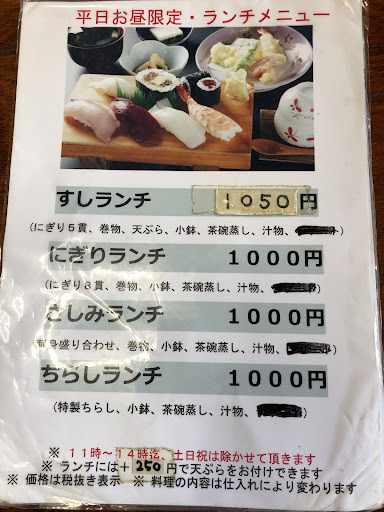 Read more時々..こちらのお店を夫婦で行かせていただいてます。 主人は、魁皇寿司を注文しますが、私は今日1人で来て寿司ランチにしました。 税込で1150円です。 にぎりが5巻・巻き寿司・納豆巻き とカンパチか、スズキの味噌汁が出てきました、その後天ぷら~茶碗蒸しときましてとてもお腹いっぱいになります。 小鉢のもずくも付いてます。 熱々の天ぷらを頂けてとても幸せです。(^-^)茶碗蒸しも可愛い茶碗蒸しでとても味がよろしいです。 古くから営業されているので 信用と実績で...