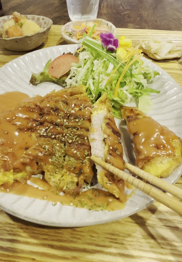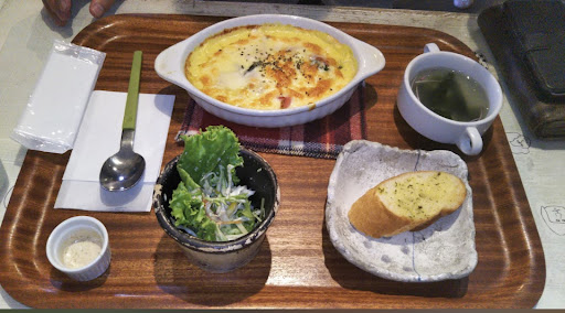 少しわかりにくいところにあるので、Googleの経路案内をお勧めします。 飯塚方面より国道200号直方バイパスの保木から降り右折後、(見通しは悪くないですが)少し狭い道もありますので 離合は譲り合って行ってください。 その後、住宅街になるので曲がる場所を間違わなければ辿り着きます。(曲がるところには分かり易く看板を立ててくれています。) お店の建物は住宅街の素敵なお家ですがブルーの文字が目立つのでcaféだと、すぐにわかります。 駐車場は、お店の斜め前にあり、こちらも看板があります。 ブルーのブランコもあるので分かり易いです。 止められる台数も多く確保されているので、駐車場には困らないと思います。 入口は学校で使っていた机にアイアンドックが出迎えてくれて入口から可愛いです! 向かいには可愛らしいベンチやチェアもあります。 天気の良い日はテラスとして利用できるのだと思います。 扉を開けるとハンドメイドの雑貨が並んでいます、店内は木を基調とし古民家風なイメージです。ベンチや学校のいすなども使われていて可愛いです。 飾りも手作りからアンティークなカメラやミシンまでおしゃれです。 今回の注文は、日替わりセットを頂きました。 メインはポークピカタ、お肉が柔らかくてボリューミーで美味しかったです。 小鉢やお漬物、このちょこっと違うものが食べられるのが嬉しいです。 サラダもお野菜シャキシャキでした、たまごスープまで付いてバランスの良い食事がとれました。 ドリンクは紅茶を頂いたのですが、えっミニデザートまで付いていました! 冷たい白玉ぜんざい、白玉もっちもちでとても満足です。 紅茶はミルクティーにして頂きました。 トータル的に満足で至福の時間を過ごせました。 とても良いカフェだと思います。