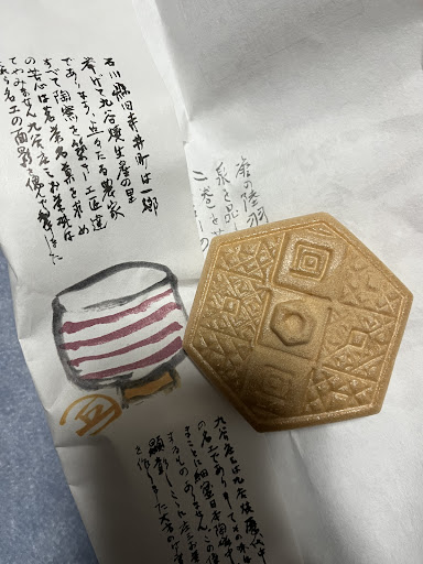 九谷庄三お茶碗(最中)が看板商品なのかな、素敵な絵の包装紙に包まれています。 かわいい型、モナカ