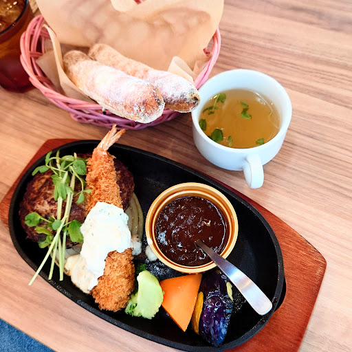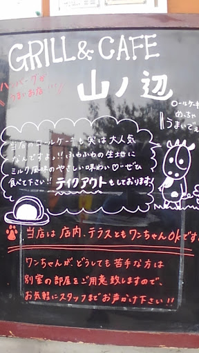Read more前に山辺スイーツカフェとしてオープンされていて、ランチのハンバーグを押し出したGRILL&CAFE山ノ辺としてリニューアルオープンされたようで、ランチをいただきに2人で来店。 ハンバーグメインでエビフライやクリームコロッケなどの惣菜とトッピングによりバリエーションは豊富である。 ハンバーグもデミソースをメインにわさびなどの和系のソースもある。 セットにはサラダとスープとライスorパンが選べパンはスティックタイプでアツアツで出てくる。 ライスは大・中・小が選べ値段は変わらない。 パンもライスも美味いし男性なら大のライスがオススメです。 ハンバーグとエビフライ、ハンバーグとクリームコロッケを注文しひとつはチェダーチーズをトッピング。 ハンバーグは肉汁が出てくるタイプだが、フワフワというよりシッカリしたタイプで肉感がある。 デミソースはアッサリして肉感のあるハンバーグの味の邪魔にならず美味い。 トッピングは好みで選べるので敢えてオススメはしないが、目玉焼きが100円でお手頃かも。 料金は普通のハンバーグセットを注文すれば、リーズナブルなランチになるが、エビフライなどの惣菜とトッピングにより思ったより高額なランチになります。 駐車場も割と広くとめやすいが開店時間の11時にならないと入り口が開かないので早めに行って駐...