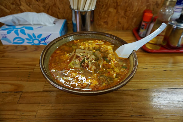 탄탄멘치곤 우리네 육계장같은 비쥬얼의 한그릇이 나온다 맛을 보니... 응? 이건 육계장?? 아.. 맵다!! 이정도면 일본인들에게 꽤 매울법한데... 스프온도는 뜨겁고 염도는 보통이다 농후하진 않은 스프는 얼큰하니 너무 맛있다 약간 지치레 중면인데 면온도가 너무 뜨거워서 큰일날뻔했다 식감은 쫄면처럼 쫄깃한게 특징이고 얼큰한 스프와 정말 어울리는 익숙한 면인데 너무 뜨겁다!! 밋찌고기들은 만두소에 들어간 고기처럼 맛있고 자체에도 간이 되어있다 멘마는 장방기성형인데 특유의 향이 좀 강한편이라 아쉽다 식사를 다 마치고 사람들이 선반위에 그릇을 올리고 휴지나 쓰레기는 모두 수거해 휴지통에 버린다 이곳의 룰같아서 나도 같이 따라했다 얼큰하게 한그릇을 든든하게 채우니 차가운 동북의 겨울바람도 한동안은 견딜 수 있을만큼 만족한 한그릇이였다!!