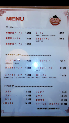 Read moreいしり(いしるともいう、魚醤)を使ったラーメンが食べられるとの事で、初めてお邪魔しました。 お父さんお母さんでやられている模様。 17時過ぎで、ほかに三組いらっしゃいました。目の前に8番ラーメンがある事を踏まえると人気店でしょうか。 メニュー(画像)は、ほぼ説明無し。少しは観光客を意識してみても?(大きなお世話か) 地元米のおにぎりも食べたかったのですが、そんなにお腹に入りません。 出てきました。 他の方のレビューにもあるように、比較的マイルドですね。 わたしは魚醤もいしるも苦手ではないのですが、もっとガツンと来たらどうかというと、具もそれ相応にあればイケそうな感じでしょうか。 する...