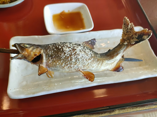Read more平日だったからか、予約なしでしたが空いてしました。 席はいわばテラス席。屋根はあり、床に蓙がしいてあり、同じく蓙の座布団なので足は痛いです。水を流していて涼しい雰囲気の演出は素敵で、扇風機も回っていますが、「外」なので暑いです。 釜飯、お刺身、塩焼きをオーダー。釜飯と塩焼きは30分くらい時間がかかると書いていましたが、塩焼きは5分くらいで提供。内蔵は取ってあるも少し苦味が残っているところが良い、想像通りの塩焼き。美味しいです。 お刺身は、「こういうものか」という感想。臭みも旨味も少ない淡白な味。骨は後から、唐揚げしてもらえます。唐揚げというより、素揚げのような感じで、これまた「油であげたのね」という印象。 そして、最後に釜飯。これは食べに行ったかいが、ある美味しさ!! もともとの炊き込んでいる汁の味が抜群♪後からほぐした鮎と味付けした炊き込みご飯が絶妙にマッチし、お焦げもちょうど良く、箸がどんどん進みます。鮎こくも美味しかった!ちょっと粒々感が感じられ、卵があったのかも…ぶつ切り感があって味噌汁の味も良かった!! 釜飯がくる頃にはビールもかなり温くなってしまっていて、ちょっとこの時期の外はちょっときついですが、釜飯はわざわざ行って、食べる価値あり、です。 また、近くに東洋のナイアガラと言われる吹割の滝があります。滝壺が見えない滝。滝と言えばそうだけど…という気持ちも残る滝なので、釜飯とセットで行けば...