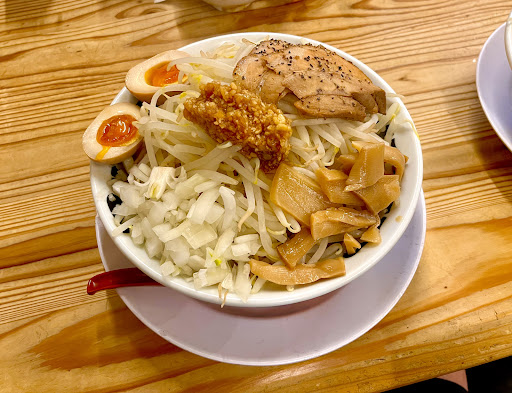 先に生卵がきたので割ってほぐして今か今かと待っていると着丼。 他の二郎系のチャーシューとは違う薄切りのお肉で、ブラックペッパーがたっぷりかかっていて香ばしいタレの香りがして最初に豚から食べちゃいました。おいしい! 野菜はもやしがメインだけど、生玉ねぎの粗みじん切りが添えられてるのは二郎系では珍しいのかな? シャキシャキの山盛りもやしにアブラと漬けニンニクを絡めて食べて胃に野菜の布団を敷いていきます。 麺はTHE二郎系なワシワシ太麺で、スープを吸って茶色くなっていて食べごたえ抜群。 スープは乳化されてない甘辛の醤油で、これが食べたかったんだよ!と思わせてくれる味。生玉ねぎの食感と甘みが後からいい仕事してて、終盤はスープに浸った麺を生卵にくぐらせてすき焼き風にして食べたら、麺量多くてもずるっと完食できました。