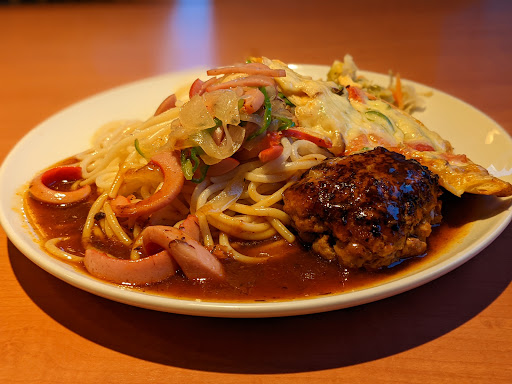 メニューはパスタやピザが並んでいました。ハンバーグのセットを注文しました。 麺はパスタなのか?柔らかめの太麺に餡をかけた物に目玉焼きが乗ったのと小さめハンバーグが2個、あとは付け合せのキャベツ?のピクルスがワンプレートに乗っていました。 味はあんかけパスタと思っていれば正解なのだと思います。知らずに食べたので期待とは違った。ハンバーグは昔ながらのタイプで美味しかった。