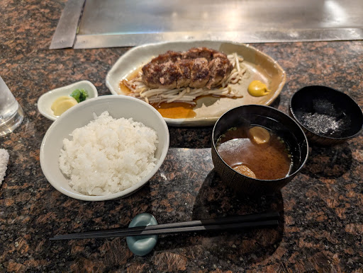 沼津へ来たら海鮮丼、と思っていつも行くお店に伺ったら臨時休業… という事で沼津港の方に向かったらたまたまこちらのお店を発見しました。 駐車場は5台程、店の前と横にあるようです、分からなければお店の人に聞くと丁寧に教えてくださいます。 平日の12時過ぎに訪問、10分程待ち席に通されました。 席は鉄板を囲むように座るカウンタースタイルで所謂オープンキッチン?と呼ばれるやつです、お店の方が目の前でお肉を焼いてくれるやつですね。 今回はハンバーグランチ(1100円)を注文 調理の工程を拝見していましたがとても丁寧、ハンバーグは片面焼いたら10分程蒸らして固くならないようにしてました。 なんだかんだで20分程で提供、こう書くと長いですが調理を見ているとあっという間です、では実食。