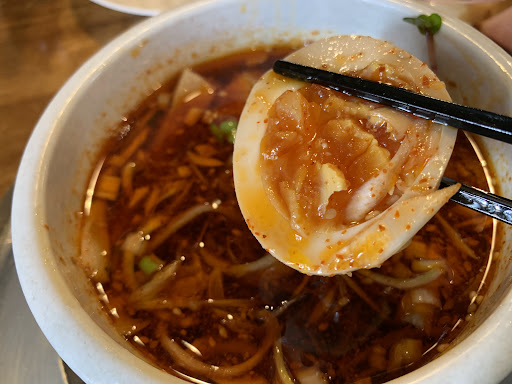 スープはラー油系、たっぷりの辛さです。 中に肉厚チャーシューがごろっと入っていました。