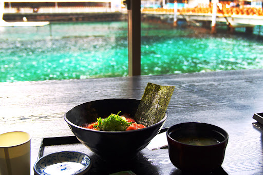 カウンター席から見える海は青く綺麗♬ その奥ではイルカショーが開催中、イルカショーを見ながら美味しいマグロ丼を頂ける特等席 次回は海の...