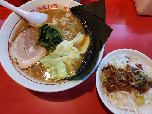 Read moreあまり並んでまで、食事をする のが嫌いな私でも、ちょうど店の、昼休憩前に、入店して、うまいラーメン、角煮トッピングは、絶妙コンビ‼️ 2021・october再訪 3年ぶりのうまいラーメン 調度正午相変わらず先客4組 待合室にコミック雑誌が 店頭の外にもベンチが設けてあり待つのは当たり前と…15分程 待ちましたが案外スンナリ入店し黒旨いラーメンとトッピング全部乗せ(850円+330円)税込み 3〜4人で入店するお客さんが 多い為すぐ満席状態❗ 魚介系スープ豚骨系+きゃべとんの様な二郎系+海苔が家系 バランス良くイイとこ取りで クセになる味ですね(*・・)σ 私的には待ってる間にも 居住空間アメニティの確保と ユックリ味わうスペースが 満腹感と価値観の点では値段 が高くても食べる前の 「ラーメン大好き小泉さん」🎵 ではないがウキウキ感がもう 1つかな👍人が多いせいか 冷房か効きすぎて待ってる間は 外のベンチで外の景色を眺めてました(;_;)⁉️☆☆☆ですが、 テイクアウトチャーシュー切端 カレー・チャーハンなど工夫し 店舗が繁盛していたので ➕☆にしました❗👍 ☆☆☆追記☆☆☆ トッピングでキャベツを グリルorレアかと問い合わせ 両方ともいらないと答えるべきでした⁉️うまいラーメンに キャベツの甘味は似合わない👍 ニンニ...