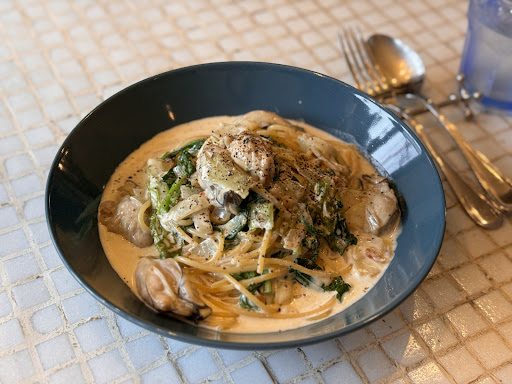 店内には入荷状況に応じて黒板にメニューがずらり、レギュラーメニューではなく今回は、黒板記載の「牡蠣のクリームパスタ」をオーダー。安定感のあるうまいパスタです。
