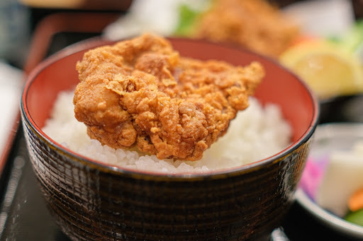 ランチをどこで食べようか迷っていたところで、こちらのお店を見つけ歴史もあるお店だから良さそうということで入りました。 多層階の店舗で、混雑時間帯から少しずれていたこともあり1階のテーブル席に案内いただきました。 メニューは豊富でうなぎとかも食べたかったのですが、ガッツリ食べたいという欲求がボリューム感がありあそうな鶏の唐揚げ定食にしました。 10分ほどすると料理が到着。 唐揚げ3個、茶碗蒸し、お味噌汁、お新香、ごはんという構成です。 唐揚げは3個ですが、かなり大きく女性だと4口くらいで食べるくらい。 肉はもも肉で、外はカリカリっとしたいい音と食感、中はジューシーで熱々。 ザ・唐揚げ、唐揚げの王道という感じもするクオリティでした。